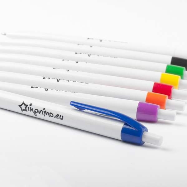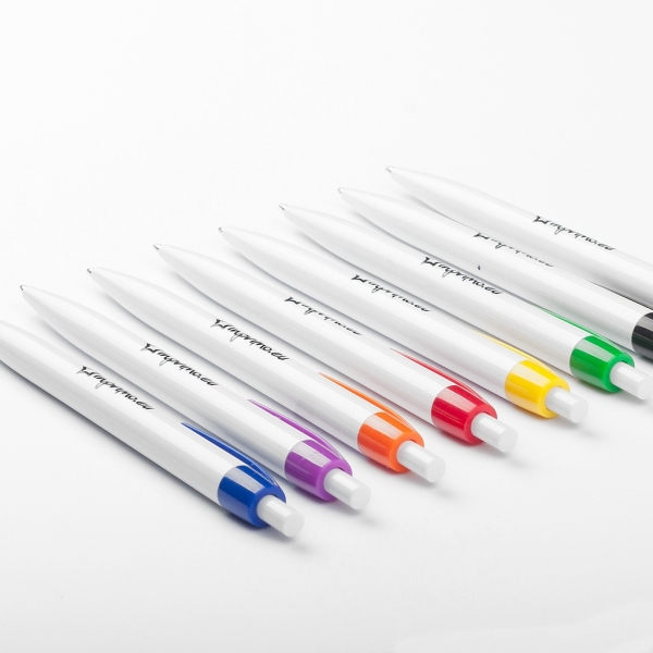 Poszukujących prostej, nowoczesnej stylistyki proponujemy model długopisu Netto. Biały, gładki oraz prosty korpus stanowi doskonałe tło dla nadruku reklamowego w każdym kolorze. Uzupełnieniem całości jest klips dostępny w przyciągających wzrok, intensywnych barwach, które podkreślają dowolny nadruk reklamowy.