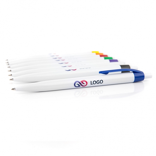 Poszukujących prostej, nowoczesnej stylistyki proponujemy model długopisu Netto. Biały, gładki oraz prosty korpus stanowi doskonałe tło dla nadruku reklamowego w każdym kolorze. Uzupełnieniem całości jest klips dostępny w przyciągających wzrok, intensywnych barwach, które podkreślają dowolny nadruk reklamowy.