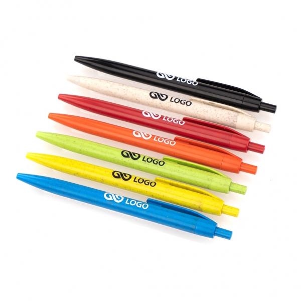 Waga: 6,8 g / Długość: 138 mm / Rozmiar nadruku: 55 x 7 mm / Typ wkładu: Slim - wymienny / Kolor wkładu: niebieski / Odblokowanie wkładu: wciśnięcie / Tworzywo: słoma pszeniczna / Opakowanie: 100 szt. / Kolor: do wyboru (niebieski, czarny, zielony, czerwony, pomarańczowy, żółty, beżowy) /