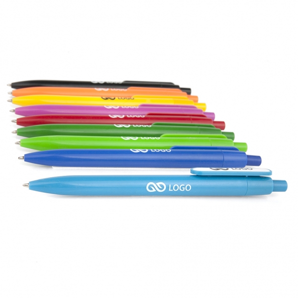 Waga: 8 g / Długość: 136 mm / Rozmiar nadruku: korpus 55 x 7 mm, klips 30 x5 mm / Typ wkładu: Slim - wymienny / Kolor wkładu: niebieski / Odblokowanie wkładu: wciśnięcie / Tworzywo: ABS, Frosty / Opakowanie: 100 szt. / Kolor: do wyboru (czarny, zielony, pomarańczowy, jasny zielony, jasny niebieski, żółty, różowy, czerwony, niebieski) /