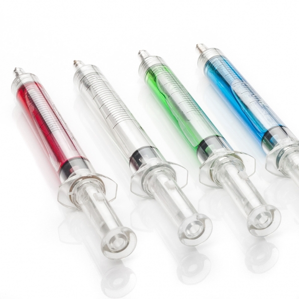 Jeżeli pośród najbardziej typowych gadżetów reklamowych, jakimi są długopisy, poszukujecie czegoś niezwykłego, oferujemy Państwu model, który niejednego przyprawi o skok ciśnienia. Gadżetem tym jest długopis do złudzenia przypominający lekarską strzykawkę. Od oryginały różni go to, iż zamiast igły posiada zwykły wkład uruchamiany mechanizmem przyciskowym. Dla wzmocnienia efektu długopis wypełniony jest kolorową cieczą, na tle której efektownie będzie prezentował się nadruk reklamowy. Gwarantujemy, że taka forma reklamy każdemu zapadnie w pamięć!