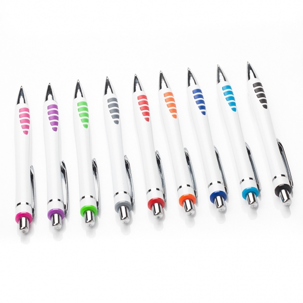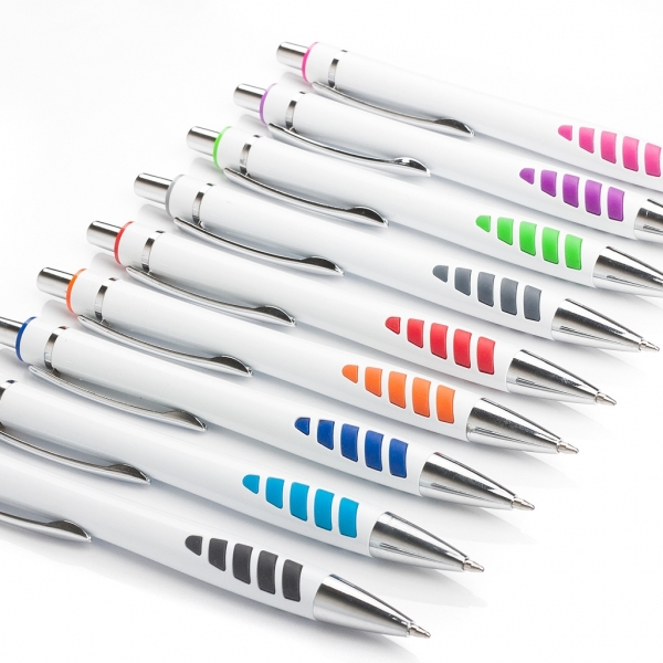 Pragniesz choć odrobiny dynamizmu w statycznej formie reklamy, jaką jest standardowy artykuł piśmienniczy z nadrukiem? Koniecznie przyjrzyj się bliżej modelowi Neptun. Jego z pozoru prosta linia korpusu, metalowy klips oraz srebrne wykończenia to klasyka. Jednak gumowe antypoślizgowe elementy wykonane w ciekawej formie, zaskakują intensywnością koloru. Nie sposób tego drobnego akceptu pominąć wzrokiem, a o przykucie uwagi odbiorcy przecież w reklamie idzie.