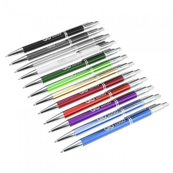 Metalowy długopis Tico zaklasyfikować można do gustownych acz niezobowiązujących upominków reklamowych. Jego aluminiowy korpus dostępny w szerokiej palecie barw, ozdobiony dwoma srebrnymi obrączkami, doskonale nadaje się do wykonania na nim trwałego znakowania laserowego. Grawerunek reklamowy zaś stylistycznie integruje całość, która odznacza się niewymuszoną elegancją.