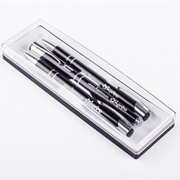 Zestaw 3 – elementowy Cosmo, w skład którego wchodzą: długopis, wieczne pióro oraz ołówek automatyczny może być eleganckim prezentem urodzinowym, jak również ładnym gadżetem reklamowym, po umieszczeniu na jego elementach nadruków reklamowych, wykonanych laserem. Niewielkich rozmiarów przybory wykonane są z aluminium, polakierowanego kolorowym lakierem, wybranym spośród wielu. Wymieniane wkłady we wszystkich przyborach, estetyczne opakowanie, powodują, że zestaw Cosmo może długo służyć użytkownikowi.